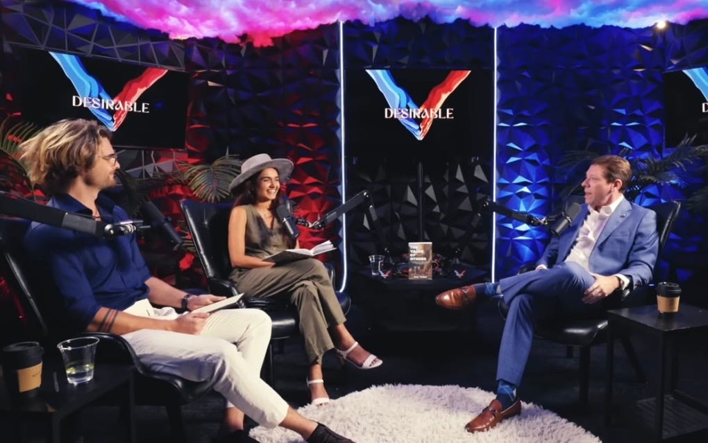 Photo: two podcasters giggle when the self styled love guru psychologist poo poos marriage